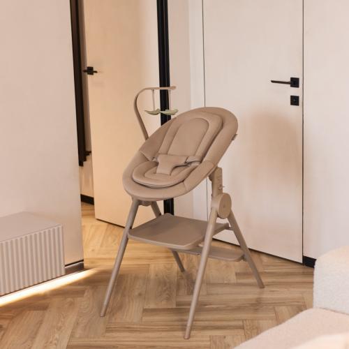 Проектирана с ергономични принципи, седалката за новородено може лесно да се регулира в две позиции на наклон и височина. Меката ергономична вложка в седалката за новородено осигурява комфортна опора. Седалката е оборудвана с играчки в контрастни форми и цветове, които нежно стимулират зрителното и сензорното развитие на бебето от първите седмици от живота му. Триточковата система за предпазни колани в седалката за новородено осигурява стабилна и удобна позиция за бебето по време на почивка и ежедневни дейности.