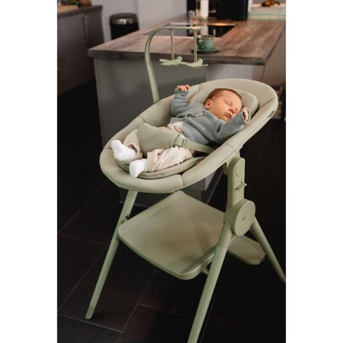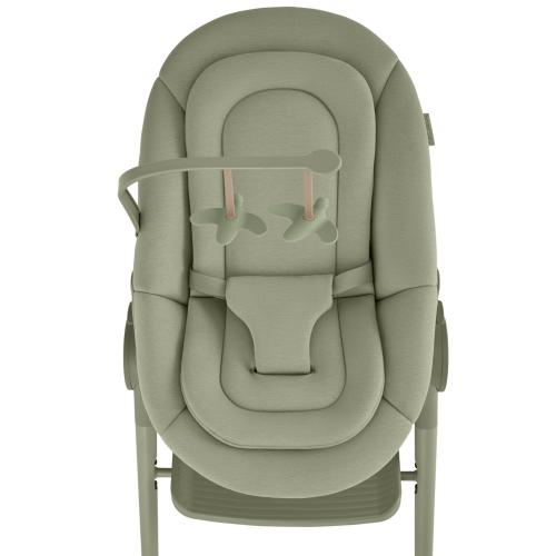 Проектирана с ергономични принципи, седалката за новородено може лесно да се регулира в две позиции на наклон и височина. Меката ергономична вложка в седалката за новородено осигурява комфортна опора. Седалката е оборудвана с играчки в контрастни форми и цветове, които нежно стимулират зрителното и сензорното развитие на бебето от първите седмици от живота му. Триточковата система за предпазни колани в седалката за новородено осигурява стабилна и удобна позиция за бебето по време на почивка и ежедневни дейности.