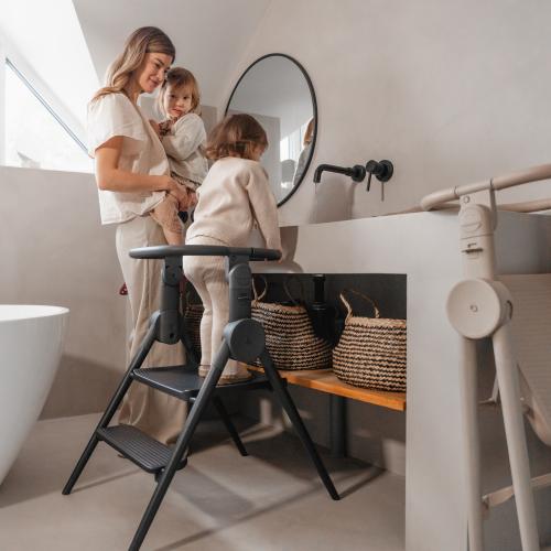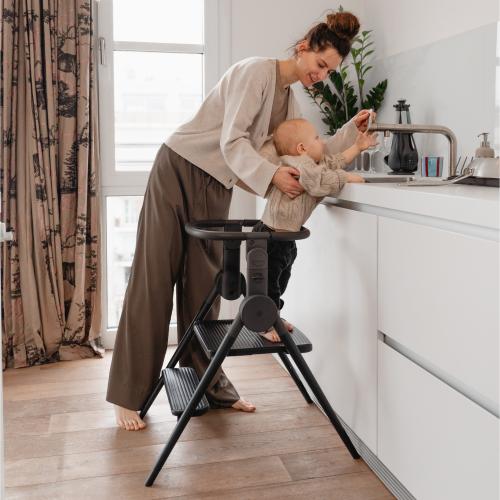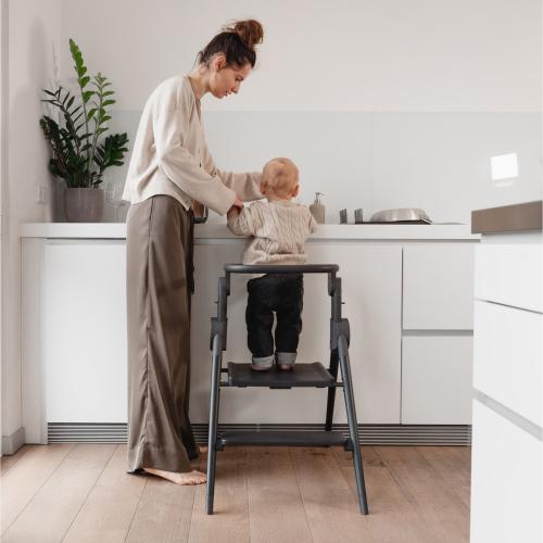 Образователна кула Kitchen Helper (до 30 кг) – със здрави предпазни парапети, двустепенна регулируема височина играчка и стабилни силиконови подложки. Идеална за игра, учене и помощ в кухнята.