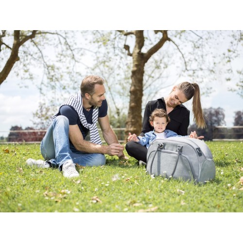 В комплекта са включени подложка за преповиване, термобокс за съхранение на бебешки храни или напитки, прозрачен плик с цип за мокри дрешки и специално джобче за залъгалки. Външният джоб с цип осигурява лесен достъп до най-важните неща, а презрамките за захващане към количката гарантират комфорт при всяко излизане.