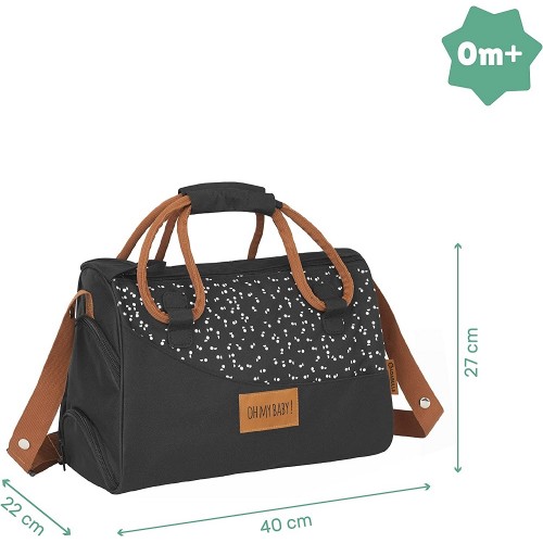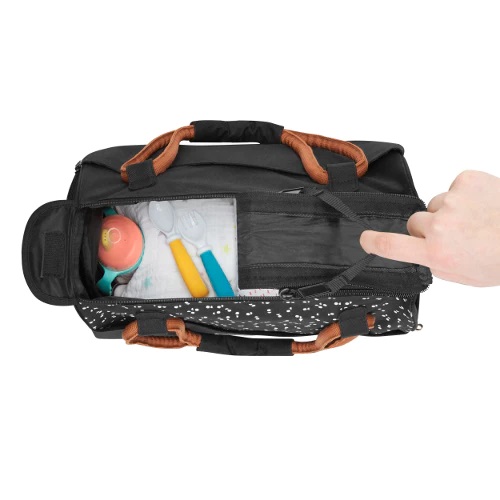 Чантата разполага с дръжки за захващане към рамата на количката, дълга дръжка за носене през рамо и къси дръжки за носене в ръка, което я прави многофункционална и лесна за пренасяне. Големият отвор с двоен цип позволява бързо и лесно поставяне на принадлежностите.