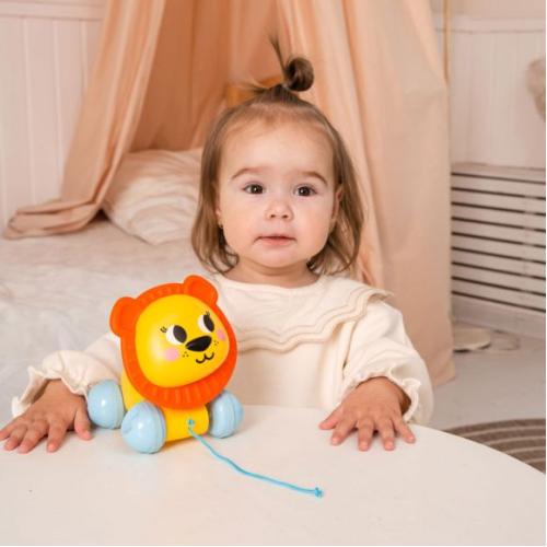 Играчките за бутане и дърпане дават на децата отлична възможност да преминат през вълнуващи преживявания! Като се научават да боравят с това ярко лъвче, бебетата ще хващат и търкалят, пълзят и ходят, подобрявайки уменията си за баланс и координация. Елементът със зъбна предавка и тактилната вложка ангажират децата в нови сензорни и фини моторни дейности и стимулира техните изобретателни идеи.