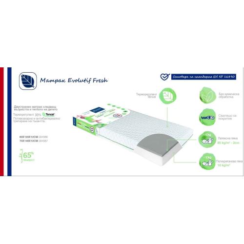 Матракът Candide Evolutif Fresh е иновативен двустранен продукт, който се адаптира към възрастта и теглото на вашето бебе, осигурявайки му оптимален комфорт и подкрепа на всяка етап от растежа. Специално разработен с две различни страни, матракът е подходящ както за новородени, така и за по-големи бебета. Две Страни за Различни Етапи на Растеж *1-ва възрастова страна: Изработена от полиуретанова пяна с плътност 16 кг/м³, тази страна е подходяща за новородени с тегло до 10 кг. Пяната осигурява достатъчна мекота и стабилност за бебето, като помага за правилното позициониране на тялото. *2-ра възрастова страна: След като бебето надмине 10 кг, можете да обърнете матрака на другата страна, която е изработена от микроперфориран латекс с висока плътност от 65 кг/м³. Тази страна осигурява по-голяма твърдост и подкрепа, отговаряща на нарастващите нужди на бебето. Отлична Терморегулация и Дишащ Материал Матракът е покрит с ултра дишащ материал Tencel, който има способността да регулира температурата на тялото, осигурявайки прохлада през лятото и топлина през зимата. Tencel е естествено влакно, което е 100% биоразградимо и притежава естествени антибактериални свойства. Този материал също така ограничава изпотяването и прави матрака мек на допир, същевременно запазвайки високата му устойчивост. Лесна Поддръжка и Безопасност Сваляемият калъф на матрака е лесен за поддръжка – може да се пере в перална машина при 30 градуса. За допълнителна безопасност, водачът на ципа е умишлено отстранен по време на производствения процес, за да се избегне всякакъв риск за бебето. Матракът е оборудван и с многократна опаковка, която улеснява пренасянето му, когато пътувате. Безопасност и Сертификация Candide поставя безопасността на вашето бебе на първо място. Матракът Evolutif Fresh не е подложен на никаква химическа обработка и е сертифициран по Oeko-Tex Standard 100 Class 1, което гарантира, че всички материали са напълно безопасни за децата. Освен това, продуктът е с 5 години гаранция и отговаря на стандарта NF EN 16890 за безопасност на бебешките матраци. Характеристики: *Размери: 60 х 120 х 12 см *Дебелина: 12 см *Плътност на пяната: 16 кг/м³ (за първата страна), 65 кг/м³ (за втората страна)