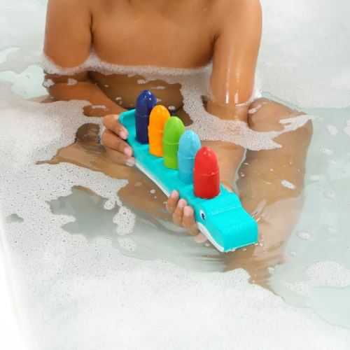 Комплектът включва пет ярки миещи се цвята – син, тюркоаз, жълт, червен и зелен, които лесно се измиват с гъба. След приключване на играта, пастелите удобно се прибират върху гърба на плаващия крокодил, който служи като поставка и забавна банска играчка.