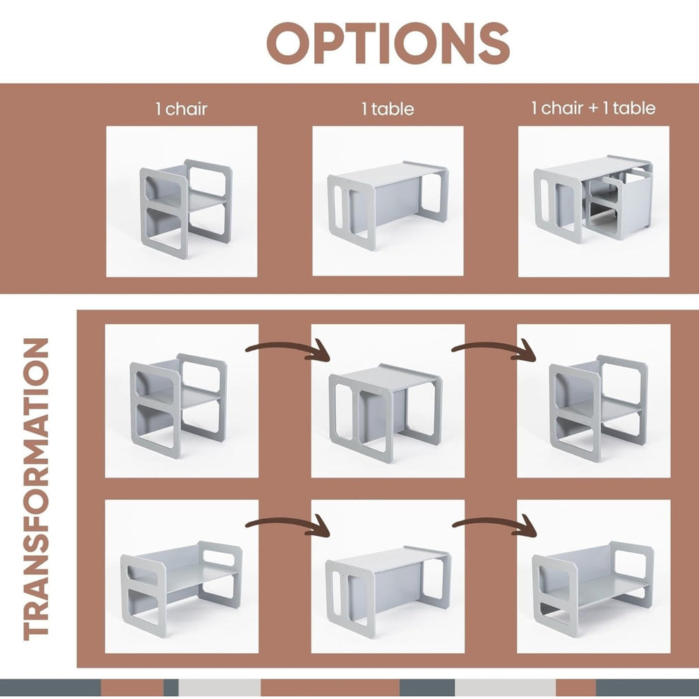 Монтесори Детска маса и Столче GINGER HOME, Дървен Комплект 3 в 1, бяло и сиво е елегантно и практично решение за всяка детска стая. Този мултифункционален комплект практично съчетава маса и столче, пейка и помощна масичка, запазвайки функционалност, стил и безопасност. Създаден по Монтесори принципи, комплектът насърчава самостоятелността, организираността и творческото мислене на детето, като същевременно е част от качествено детско обзавеждане.