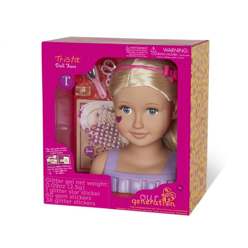 Куклата за стилизиране Our Generation Trista е чудесен начин да практикувате стилизиране, декориране и създаване на нови прически – за себе си и вашите кукли! Включената книжка съдържа инструкции как да правите уникални прически... и с въображението си можете да създадете още много! Изпробвайте прическите върху Триста и след това ги повторете върху себе си! Тази красива стилизираща глава за кукли с размер 23 см е идеалното място да изпробвате вашите блестящи идеи.