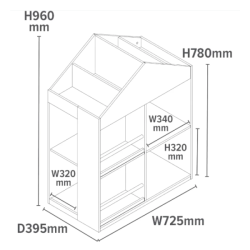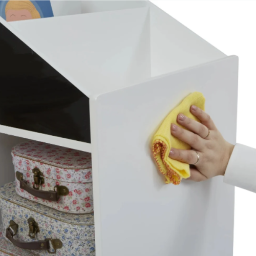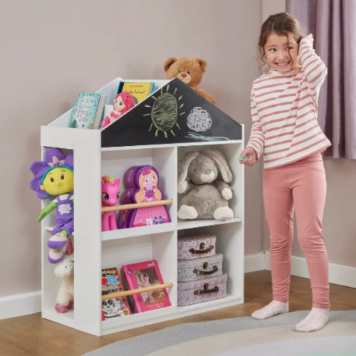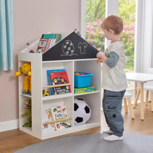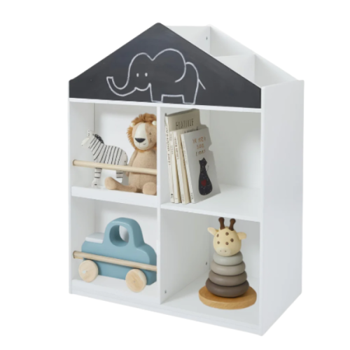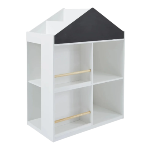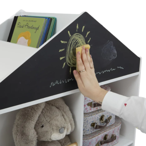 Със своя оригинален дизайн във формата на къщичка с прозорчета, тази мебел превръща съхранението в забавление. Етажерката разполага с 6 отворени отделения и един страничен сектор, които предоставят достатъчно място за кутии, пъзели, настолни игри и други. Вградената черна дъска за рисуване с тебешир е чудесна за развиване на креативността и фината моторика.
