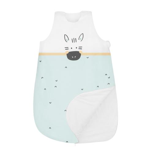 Изработен е от деликатна комбинация от памук ранфорс и памучно трико – тъкани, които са щадящи към чувствителната бебешка кожа и същевременно издръжливи на ежедневно пране. Пълнежът от лека полиестерна вата осигурява равномерна топлина без риск от прегряване. Ципът по цялата страна, снабден с предпазен протектор, позволява бърза и лесна смяна, без да нарушава съня. Презрамките с тик-так копчета осигуряват удобно закопчаване и стабилно прилягане, дори при по-активно бебе.