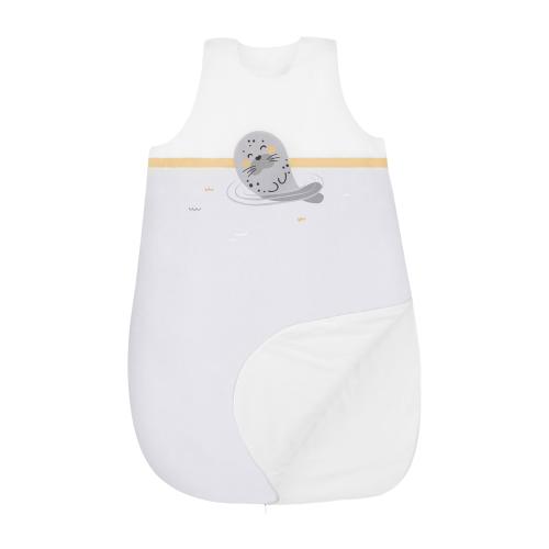 Изработен е от деликатна комбинация от памук ранфорс и памучно трико – тъкани, които са щадящи към чувствителната бебешка кожа и същевременно издръжливи на ежедневно пране. Пълнежът от лека полиестерна вата осигурява равномерна топлина без риск от прегряване. Ципът по цялата страна, снабден с предпазен протектор, позволява бърза и лесна смяна, без да нарушава съня. Презрамките с тик-так копчета осигуряват удобно закопчаване и стабилно прилягане, дори при по-активно бебе.