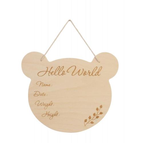 Табелката „Hello World“ (Здравей, свят!) е идеална за отбелязване на името, датата, теглото и височината на новороденото. Тя може да се използва както за декорация на стаята, така и за специални снимки от първите дни на бебето.