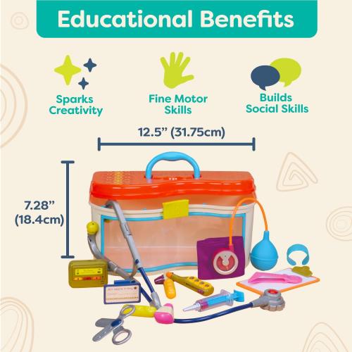 Детският докторски комплект Battat е идеалната играчка за малките изследователи, които обичат да помагат и да се грижат за другите. С него всяко дете може да влезе в ролята на истински лекар и да се забавлява, докато развива своето въображение, координация и комуникативни умения.