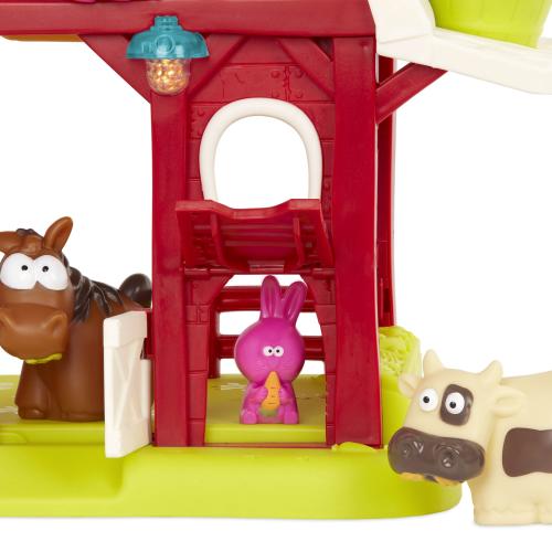 Плевнята разполага с четири животни – прасе, овца, крава и кон. Когато всяко от тях бъде поставено на съответното място до вратата, се чува неговият характерен звук. Тази функция подпомага слуховото възприятие и способността на детето да разпознава животни и техните гласове.