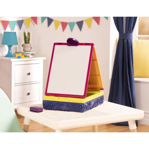 Преносимият двустранен статив Battat предоставя на децата свобода да изразят творчеството си по забавен и образователен начин. С две различни повърхности – бяла и черна дъска, той позволява рисуване с маркери или тебешири и лесно изтриване на създадените творби.