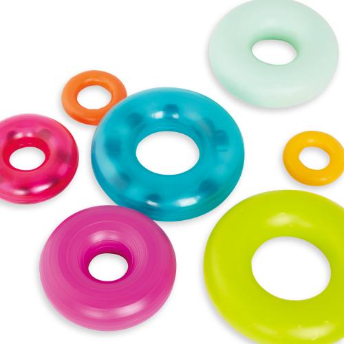 Комплектът включва 7 пръстена за сортиране и нанизване, които могат да се подреждат по различни начини. Играчката стимулира мисловните и моторни способности на детето, като насърчава логическото мислене и креативността.