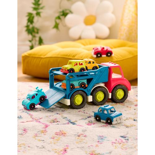 Автовозът от серията Battat Wonder Wheels предлага на детето възможност да товари, разтоварва и подрежда шестте включени колички. Тази активна игра развива фината моторика и логическото мислене, докато малчуганът експериментира с движение и баланс. Големият камион и малките автомобили предоставят разнообразни сценарии за ролеви игри, насърчавайки творческото мислене.