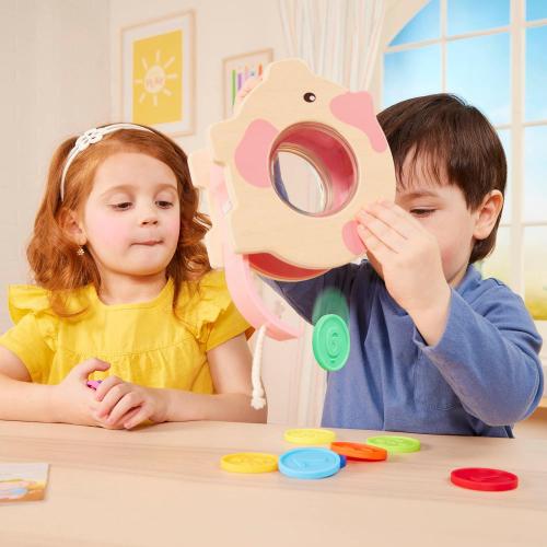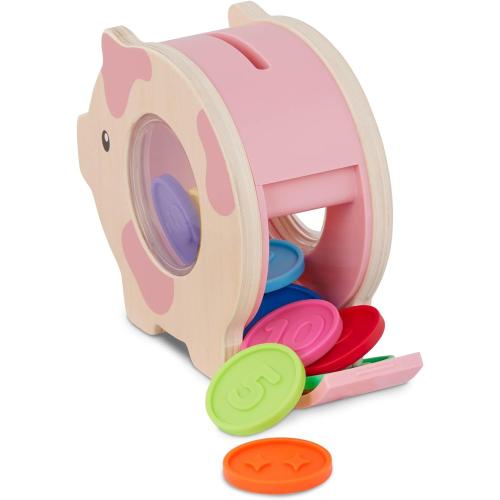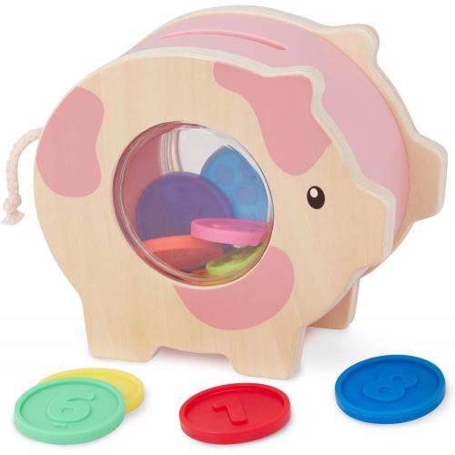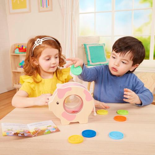 Комплектът включва 10 ярки, номерирани монети за игра, които помагат на детето да упражнява броене, разпознаване на цветове и координация око-ръка. Докато пуска монетите в касичката под формата на прасенце, мъникът усъвършенства фините си двигателни умения.