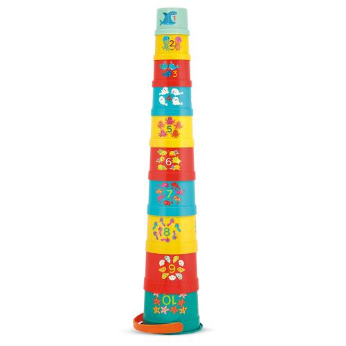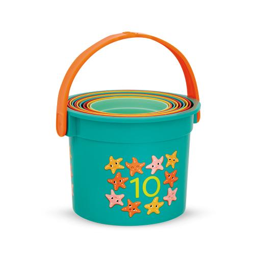 Комплектът включва 10 цветни кофички с гладка, безопасна за детето повърхност. Всички кофички се съхраняват лесно в най-голямата кофа с удобна дръжка, което прави прибиране и пренасяне бързо и практично. Материалите са безопасни и подходящи за игра във вода и пясък.
