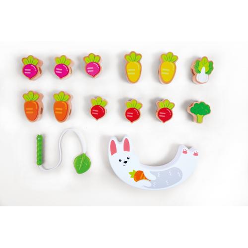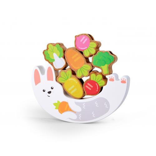 В центъра на играта стои усмихнатото дървено зайче – стабилна основа, върху която детето подрежда различни зеленчукови блокчета: дълги и къси моркови, броколи и листа от маруля. Целта е да се постигне баланс, без фигурките да паднат. Играта съчетава забавление с предизвикателство и стимулира концентрацията, вниманието и логическото мислене.
