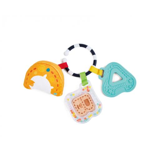 Hape „ABC“ впечатлява с богатството си от детайли – ярки цветове, разнообразни повърхности и нежни звуци, които насърчават изследователския дух на бебето. Тя може да се използва като дрънкалка за слухова стимулация, като гризалка за облекчаване на венците или просто като мека приятелска играчка. Благодарение на удобната халка, играчката лесно се прикрепя към бебешка количка или чанта, осигурявайки забавление навсякъде.