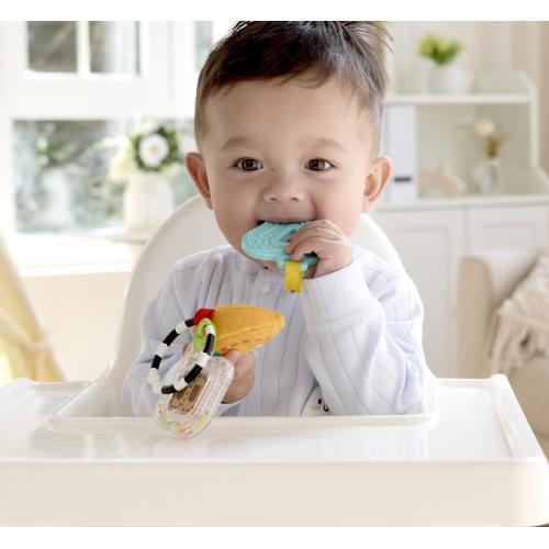 Изработена от висококачествени, безопасни и нетоксични материали, играчката е мека на допир и подходяща за дъвчене. Текстурите са внимателно подбрани, за да стимулират сетивата и да осигурят комфорт при никнене на зъбки. Всички части са трайни и лесни за почистване, което я прави идеална за ежедневна употреба.