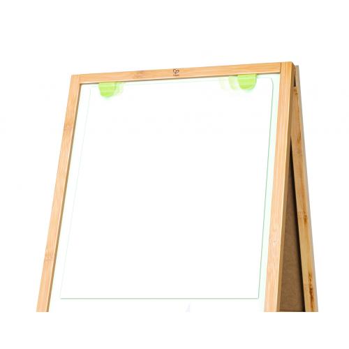Развихрете креативността на детето си с детския бамбуков статив Hape, който предлага разнообразие от възможности за рисуване и забавление. Той съчетава черна дъска, магнитна бяла дъска и хартия, позволявайки на малките художници да експериментират с различни материали и техники. Идеален е за стимулиране на въображението, концентрацията и артистичните умения.