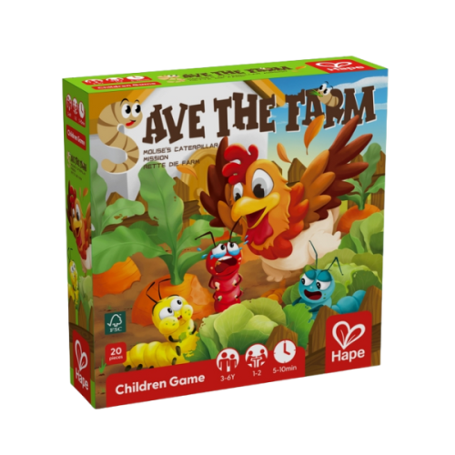 Помогнете на сладкото животинче Молис да защити фермата си с детската настолна игра Hape „Спаси фермата“. Тази забавна и интерактивна игра развива наблюдателността, координацията и стратегическото мислене на децата, като същевременно предлага динамично забавление за двама играчи.