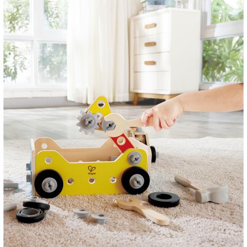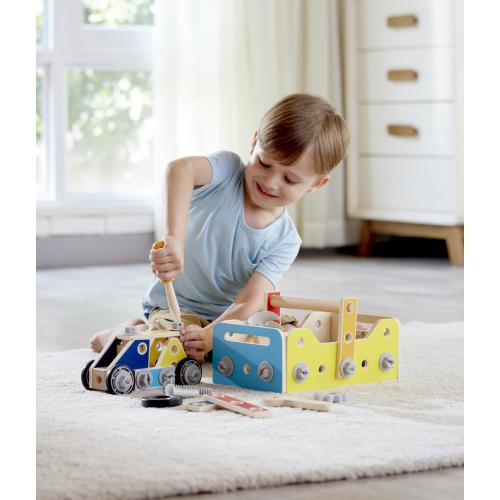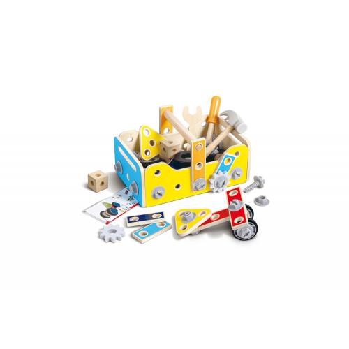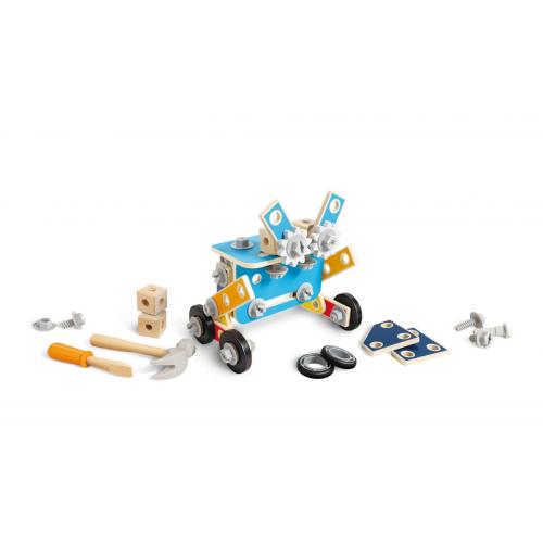 Кутията включва 83 части – винтове, гайки, дървени и пластмасови елементи, както и различни инструменти. Детето може да конструира коли, самолети и други проекти, като същевременно усъвършенства дизайнерските, инженерните и логическите си умения. Комплектът предлага различни нива на трудност и удобни опции за съхранение на частите.