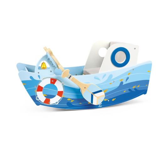 Лодката е изработена от висококачествено дърво с безопасни и устойчиви бои. Всички части са проектирани да издържат на интензивна игра, като същевременно са безопасни за малки ръчички. Омекотената седалка осигурява комфорт и уют при игра, а декоративните морски мотиви стимулират визуалното възприятие и въображението.