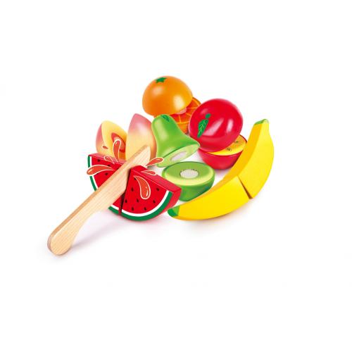 Открийте забавлението и обучението с детския дървен комплект за рязане Hape „Плодове“. Той позволява на децата да развиват сръчност, координация и фината моторика чрез безопасна и реалистична игра с дървени плодове.