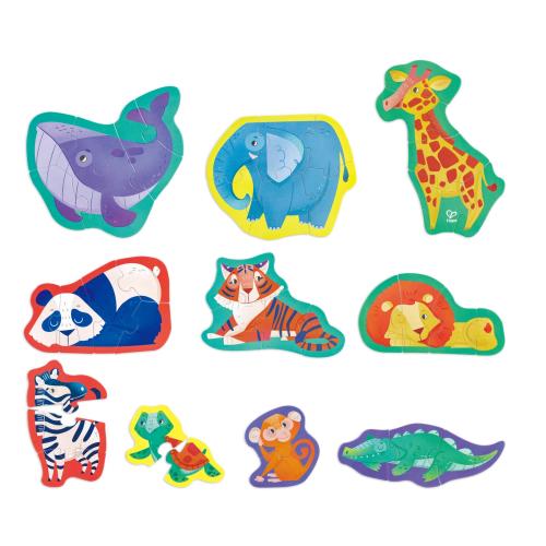 Комплектът съдържа 10 пъзела с различни животни от джунглата – зебра, слон, крокодил, костенурка, кит, жираф, маймуна, тигър, лъв и панда. Децата могат да научат характерните белези на всяко животно, да откриват къде живее и какъв звук издава, докато се забавляват със сглобяването на ярките и симпатични изображения.