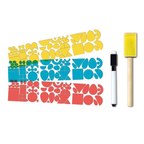 Комплектът съдържа 177 части в три основни цвята – червен, жълт и син – и различни форми, включително триъгълници, кръгове и квадрати. Включен е и черен изтриваем маркер, с който децата могат да рисуват, да създават картини или да оформят свои собствени истории върху специалната повърхност. Играта с цветовете и формите подпомага визуалното възприятие и пространственото мислене, като едновременно развива артистичния усет.