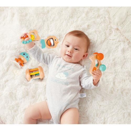 Комплектът съдържа 5 части – дрънкалка, гризалка, стабилна дрънкалка, търкалящо се кученце и мека дрънкалка. Всяка играчка е проектирана така, че да подпомага различен етап от развитието на бебето – от захващане и стискане до пълзене и ранна координация. Играчките насърчават активното движение и стимулират слуха, зрението и осезанието.