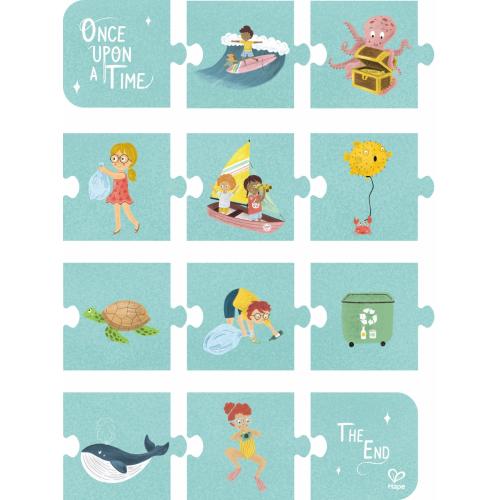 Комплектът включва 3 пъзела по 48 части, 12 плочки за разказване на истории и удобен плакат, който помага на детето да подреди пъзелите и може да се използва като декоративен плакат за стената на детската стая. Пъзелите изобразяват цветни океански сцени с риби, китове, сърфисти и щастливи плажуващи, стимулирайки разказването на истории и творческото мислене.