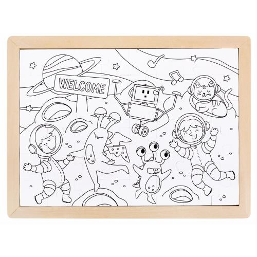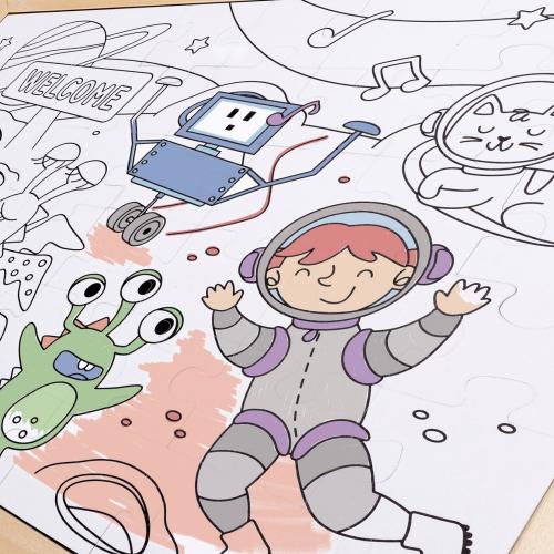 Комплектът включва 48 части двустранен пъзел и удобен плакат, който се побира в капака на кутията и служи за помощ при сглобяването, както и за декорация на детската стая. Едната страна представя цветна космическа сцена с астронавти, планети и извънземни, а другата е черно-бяла за оцветяване от детето, което насърчава креативността и въображението.