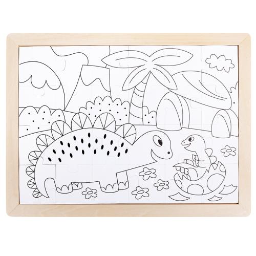 Комплектът включва двустранен пъзел с 24 части и удобен плакат, който помага на детето при подреждането на пъзела или може да се използва като декоративен елемент за стената на спалнята. Едната страна представя цветна праисторическа сцена с динозаври, екзотичен растителен свят и други, а другата страна е черно-бяла, предназначена за оцветяване от детето, стимулирайки въображението и вниманието към детайла.