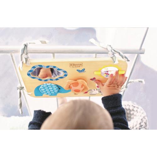 Дъската включва огледало, слонче с набръчкани уши, цвете, което скърца, зебра с щракаща глава и въртяща се дрънкаща топка от мъниста. Тези елементи позволяват на детето да развива фината моторика, наблюдателността и причинно-следствените връзки, като се забавлява чрез сензорна игра.