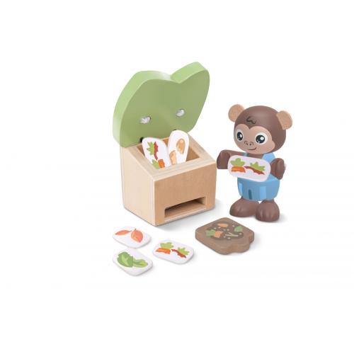 Играчката е изработена от висококачествени и екологично чисти материали, безопасни за деца. Дървените елементи са здрави и устойчиви на многократна употреба, а цветните компоненти и аксесоари стимулират визуалното възприятие и интереса към природата.