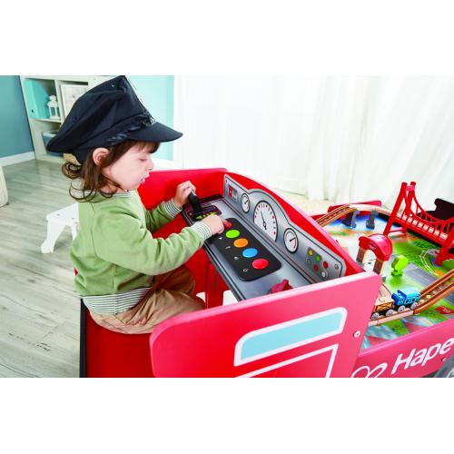 Детското дървено влакче за сядане Hape със звук и светлина е перфектната комбинация между забавление и обучение — вдъхновява малките машинисти да изследват, да се забавляват и да развиват въображението си с всяко пътуване.