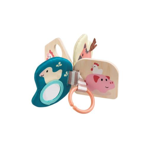 Специални ефекти като огледала и пукащо фолио правят играта още по-забавна и стимулираща. Практичната халка позволява лесно закрепване към колички, столчета или други повърхности. Страниците с текстура могат да се свалят и перат благодарение на велкро лентите, което поддържа книжката хигиенична и безопасна.