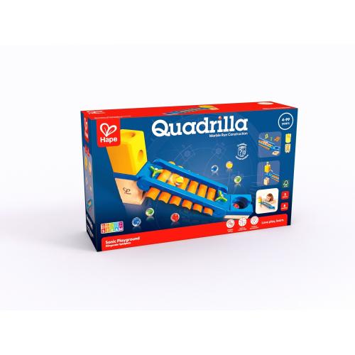 С дървената писта с топчета, Quadrilla Музикална пързалка, децата ще се забавляват, като плъзгат стъклените топчета по пързалката. Докато топчетата се спускат, от ксилофона излиза чист звънтящ звук, а те преминават през интересни тунели и препятствия, докато достигнат крайната си цел – дупката. Заниманията с играчката стимулират фината моторика, въображението и музикалния слух. Дървените части са боядисани с бои на водна основа, безопасни за децата.