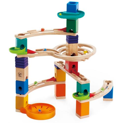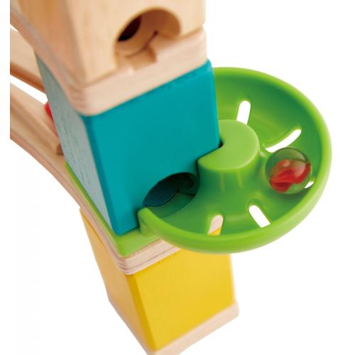 С дървената писта с топчета, Quadrilla Катерачът, децата ще се забавляват, като конструират и пускат топчетата през тунели, мостове, фунии и проходи. С 44 нестандартни елемента и 50 топчета, всяка игра предоставя уникално преживяване и възможност да се наблюдават физични явления като движение, гравитация и скорост. Играта стимулира логическото, последователното и инженерното мислене, като развива фината моторика и координацията око-ръка.