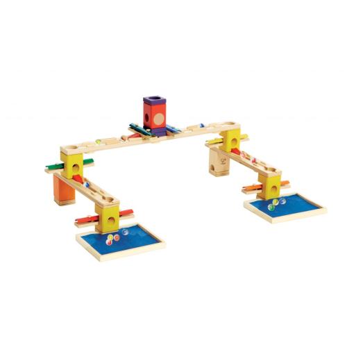 С комплекта дървена писта Hape, Quadrilla, Бягство от замъка, децата могат да се потопят в завладяваща игра с топчета, като едновременно се забавляват и усвояват основни физични принципи. С 52 нестандартни елемента, включително тунели, проходи, мостове и фунии, малчуганите могат да пускат едно по едно 50-те топчета в комплекта и да наблюдават тяхното движение.