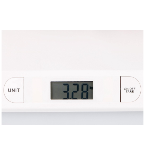 Дигиталната бебешка везна работи с 2 батерии AAA (включени в комплекта). Има бутон за включване/изключване и се изключва след известно време, за да пести енергия. Ще получите и известие, когато батериите са почти празни. В този случай дисплеят ще покаже 'LO'.