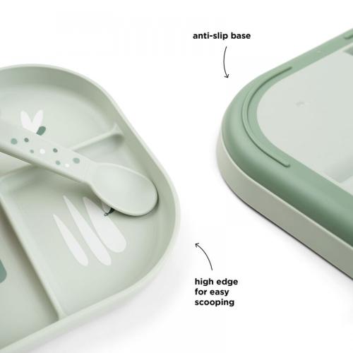 Чинията има три отделения, които запазват храната отделно, а високите ръбове улесняват загребването – идеални за малки ръчички. Противоплъзгащата основа гарантира, че чинията ще остане стабилна върху масата по време на хранене.