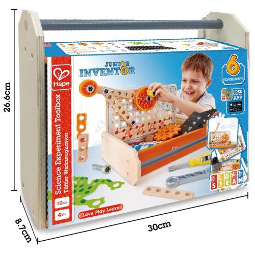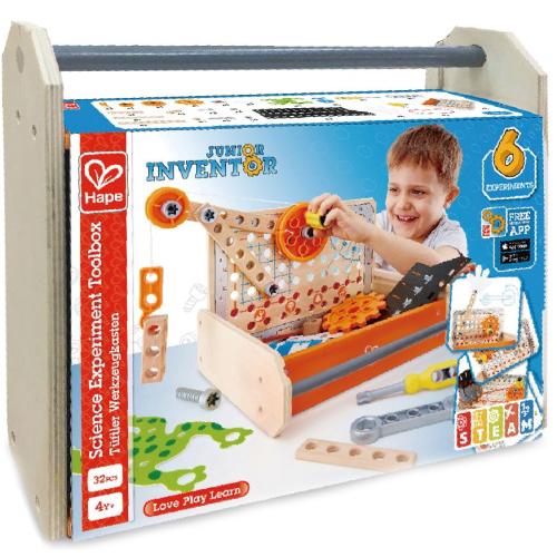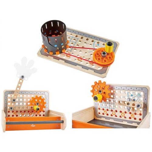 С детския дървен комплект за игра Hape, Млад изобретател, децата ще се превърнат в истински малки инженери и учени, готови да откриват и експериментират! Комплектът предлага възможност за изработка на над 6 различни експеримента, които въвеждат малчуганите в основните принципи на механиката и физиката по забавен и достъпен начин.