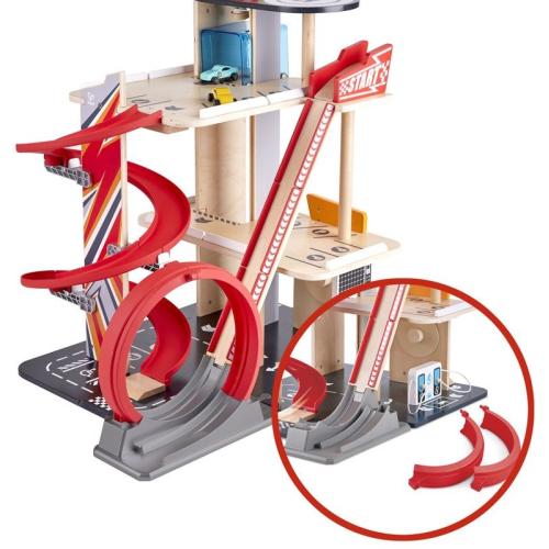 С детския дървен комплект за игра Hape, Състезателна каскадна писта с гараж вашето дете ще се потопи в света на скоростта, приключенията и инженерното въображение. Този изключително детайлен и функционален гараж за коли предлага три нива на забавление, множество рампи и писти, асансьор за автомобили и дори специални ефекти като скокове и примки за истински каскади.