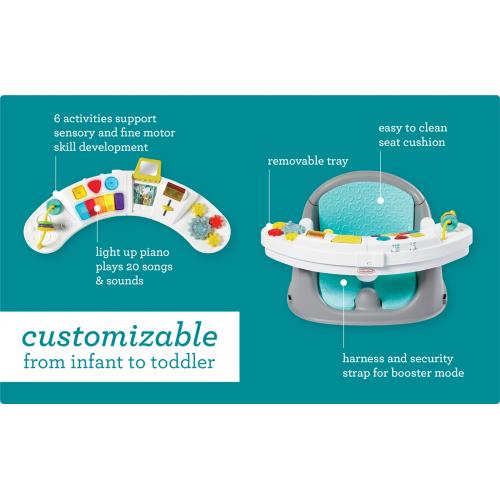 Седалката 3 в 1 е интерактивно място за игра, седалка за закуска и сигурен бустер всичко в едно. Подкрепете ранното седене на малките в режим на позициониране на столчето, като същевременно ги държите щастливо ангажирани с 6 забавни дейности, включително светещо пиано с 20 песни и звука. Стимулиращите играчки насърчават сензорното развитие и спомагат за изграждането на фина моторика и могат да се свалят за игра на пода или забавление в движение. Когато вашето мъниче е готово за хапване, плъзнете играчките една от друга, за да разкриете поднос за хранене с поставка за чаши. Удобните предпазни колани позволяват лесното закрепване на повдигащото столчето към кухненски стол, а меката пяна седалка е удобна за бебето и лесна за почистване след хранене.