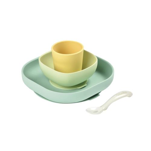 Чинията и купата са снабдени с всмукващо дъно, което осигурява стабилност върху масата и предотвратява разливане. Чашата и лъжицата са ергономично проектирани за малките ръчички на бебето, което улеснява захващането и самостоятелното хранене. Всички елементи от комплекта са изработени от висококачествен силикон и са напълно безопасни – без съдържание на олово и фталати.