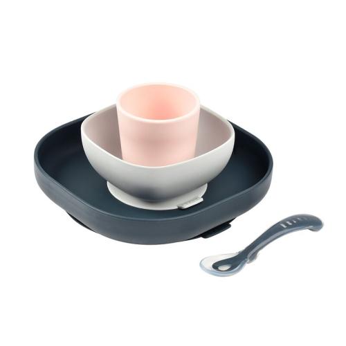 Чинията и купата са снабдени с всмукващо дъно, което осигурява стабилност върху масата и предотвратява разливане. Чашата и лъжицата са ергономично проектирани за малките ръчички на бебето, което улеснява захващането и самостоятелното хранене. Всички елементи от комплекта са изработени от висококачествен силикон и са напълно безопасни – без съдържание на олово и фталати.