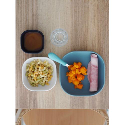 Комплектът включва три купички с различни размери, които се развиват заедно с детето – от първото хранене до 36 месеца и повече. Ергономичните форми улесняват детето при самостоятелно хранене и подпомагат правилното използване на приборите. Купичките позволяват храната да се предлага отделно, като се запазват вкусовете и текстурите на всяка храна, което прави всяко хранене приятно и разнообразно.